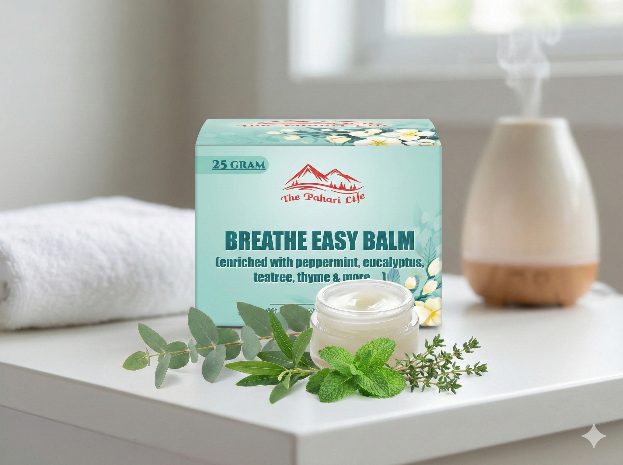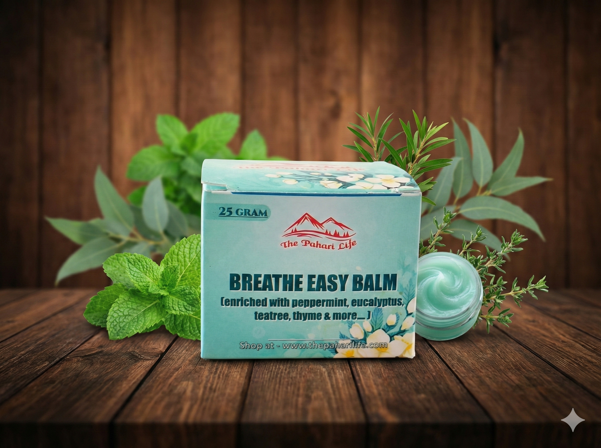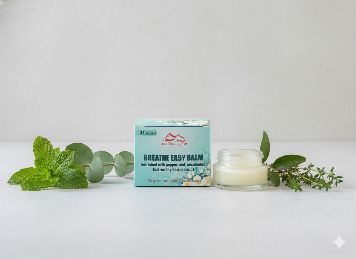 The Pahari Life's Breathe easy balm is 100% natural & organic and is formulated to soothe the inflamed mucous membranes and clear the airways to give you and your little one’s a relaxed sleep during cold & cough. Made with eucalyptus, peppermint, ginger and many more ayurvedic herbs to provide needed relief from respiratory disorders. This 100% plant derived blend of herbs and oils is completely free from synthetics and petroleum derived ingredients.. It relieves minor throat and bronchial irritations and eases minor aches and pains in muscles. It unclogs nostrils from nasal congestions to give a relaxed sleep & treats both dry and wet coughs. Its safe to use on babies as well.
