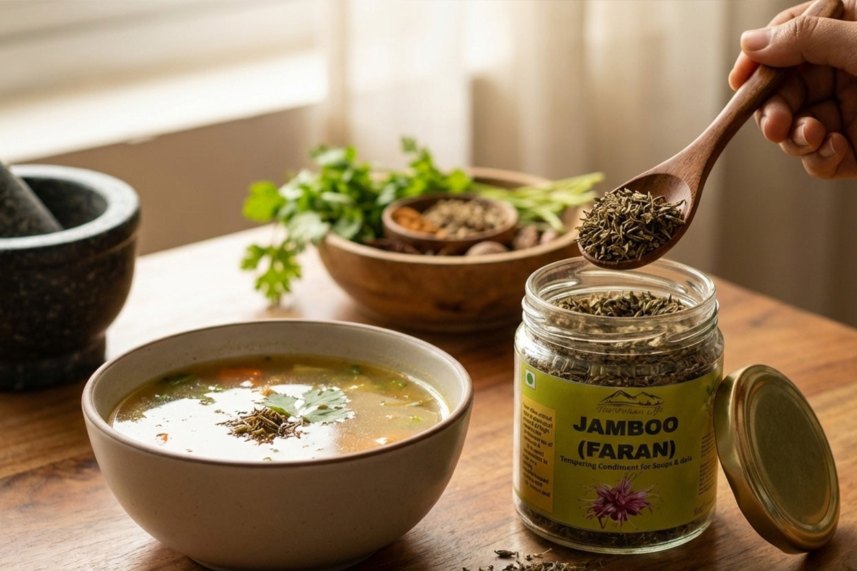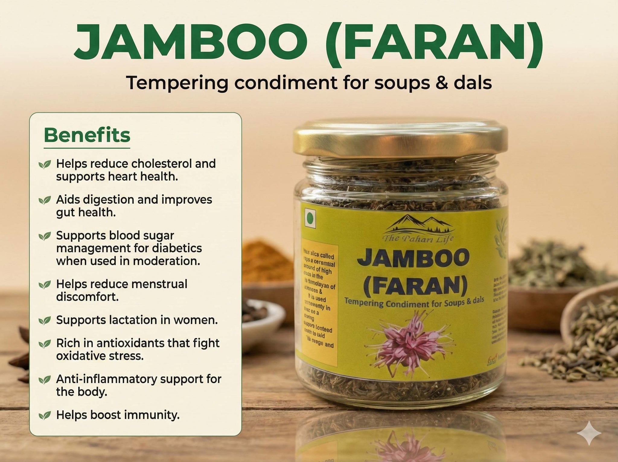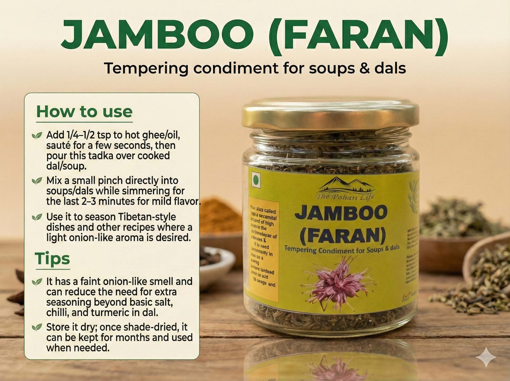 Jamboo adds a delicate onion-like aroma and rich flavour, often eliminating the need for additional seasoning beyond salt and spices. Known for its strong aroma and visual appeal, this dried herb can be stored for months and used whenever needed, enhancing both taste and nutrition.