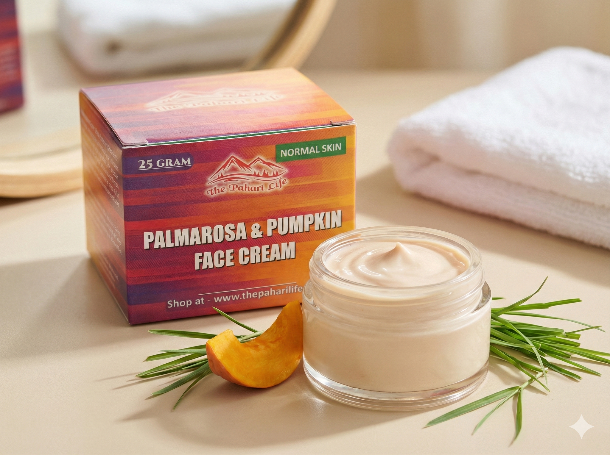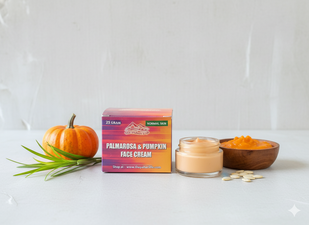 The Pahari Life's Palmarosa & Pumpkin face cream is a unique oil combination rich in Oleic and Linoleic (healthy fatty acids) to moisturize, nourish and protect the skin. It provides effective moisturization and works well on spots and discoloration.