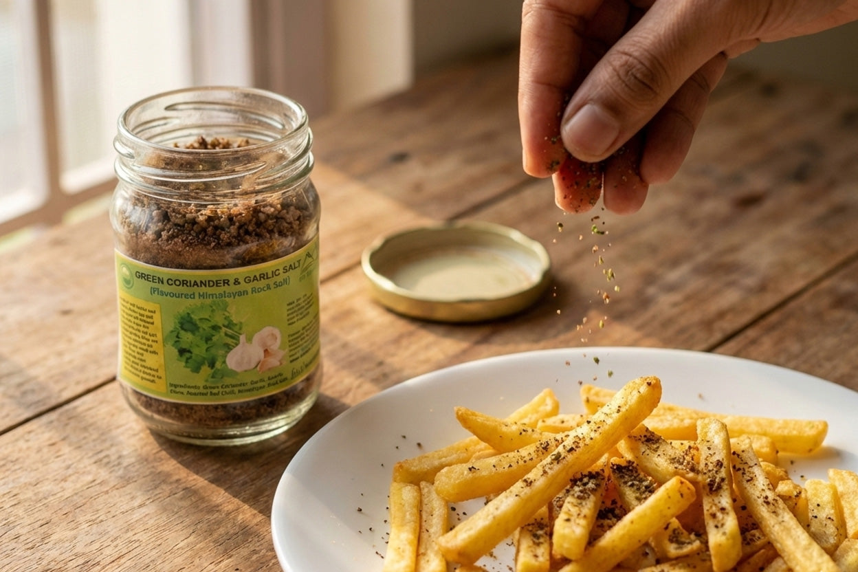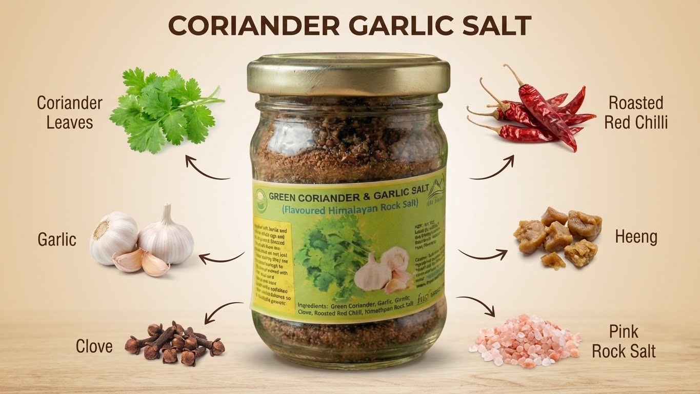 Green Coriander & Garlic Salt is a traditional flavoured salt (sil pisi loon/noon) from Uttarakhand that adds an extra dimension to your cooking with its fresh green colour and savoury aroma. It works beautifully when sprinkled over finished dishes as a garnish, giving instant flavour without needing a whole shelf of spices.