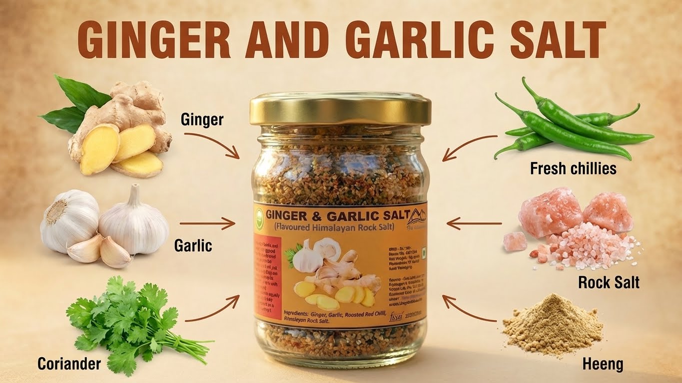 Ginger & Garlic Salt is a traditional flavoured salt (sil pisi loon/noon) from Uttarakhand that adds an extra dimension to your cooking with its warm colour and robust aroma. It works equally well sprinkled over finished dishes as a garnish, giving you instant ginger-garlic flavour without needing multiple separate spices.