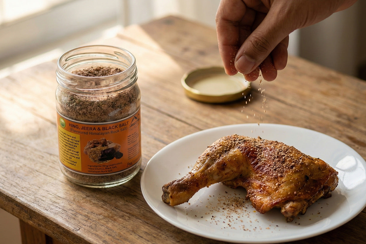 This flavour-infused salt is a versatile seasoning you can use on salads, soups, pizzas, fried or boiled eggs, breakfast toast, and roasted vegetables. It is also excellent for rubbing onto meat before grilling or marinating, and for adding a tangy, savoury lift to dal tadka, raitas, cut fruits, chutneys, lassi, French fries, or for marinating paneer and chicken—making it a handy all-rounder in everyday cooking.