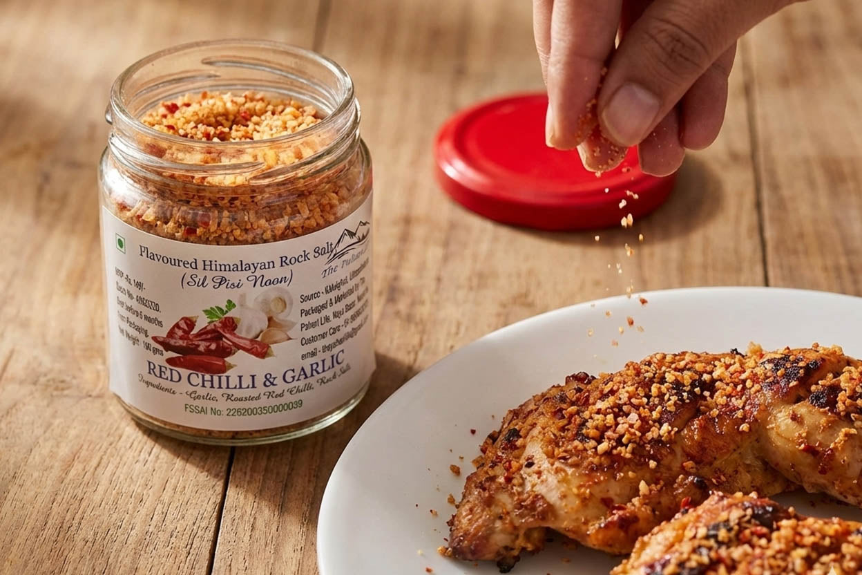 Pahari Red Chilli & Garlic Salt (Sil Pisi Loon / Noon) from Uttarakhand adds a bold, spicy dimension to everyday cooking with its vibrant colour and rich aroma. Crafted as a finishing salt, it works beautifully when sprinkled over prepared dishes as a delicious garnish, offering a quick way to elevate flavour without relying on a store cupboard full of spices.