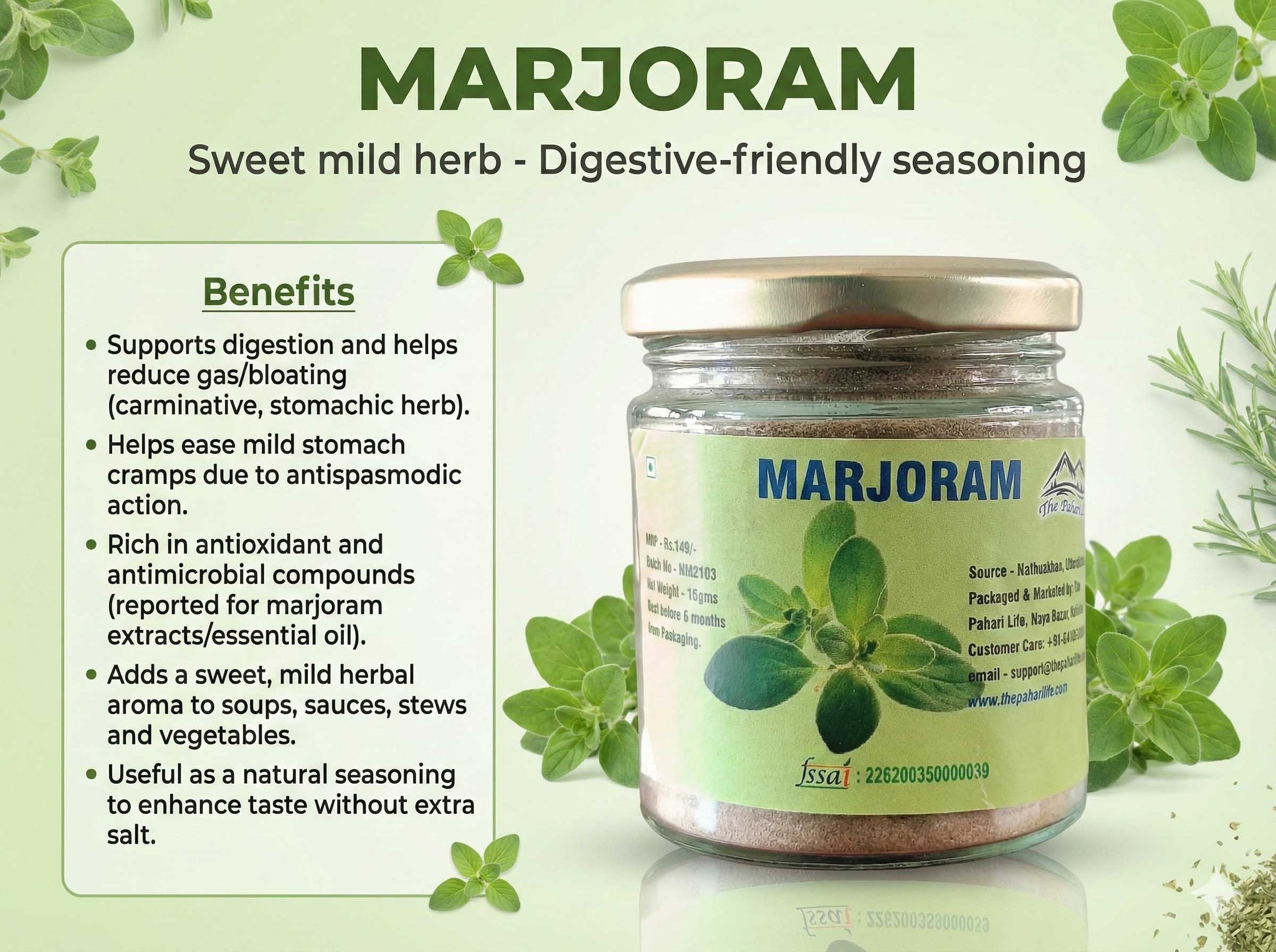 Pahari Marjoram, also known as sweet marjoram, is an aromatic herb from the mint family and is closely related to oregano, though it has a milder and more delicate flavour. Highly valued for its pleasant fragrance, marjoram is used fresh or dried to garnish salads, soups, and meat dishes, and its leaves can also be brewed into a soothing herbal tea or prepared as an extract.