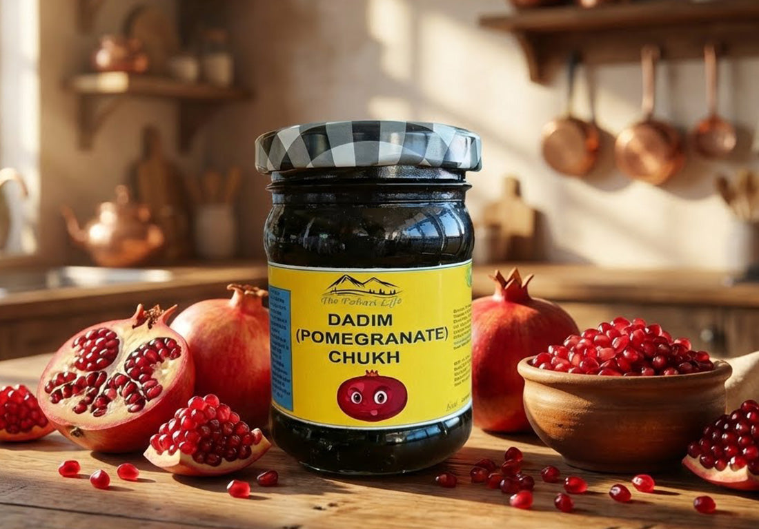 The juice of Dadim is slowly cooked for hours over a wood or charcoal fire in iron utensils until it thickens into a dark, rich concentrate known locally as Chukh. Stored in glass bottles, this intensely sour preparation is long-lasting and widely used in chutneys, soups, and traditional dishes. Chukh is also known for its medicinal properties and is traditionally used to support digestive health.