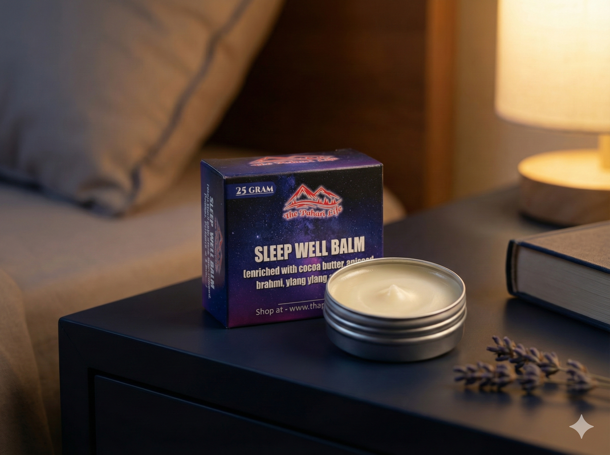 The Pahari Life's Sleep well Balm with its therapeutic and aromatic essential oils helps improve sleep & its pattern over time. It soothes the mind, overcomes stress, restlessness & promotes healthy and quality sleep. The earthy aroma in the balm is derived from edible steam distilled essential oils.