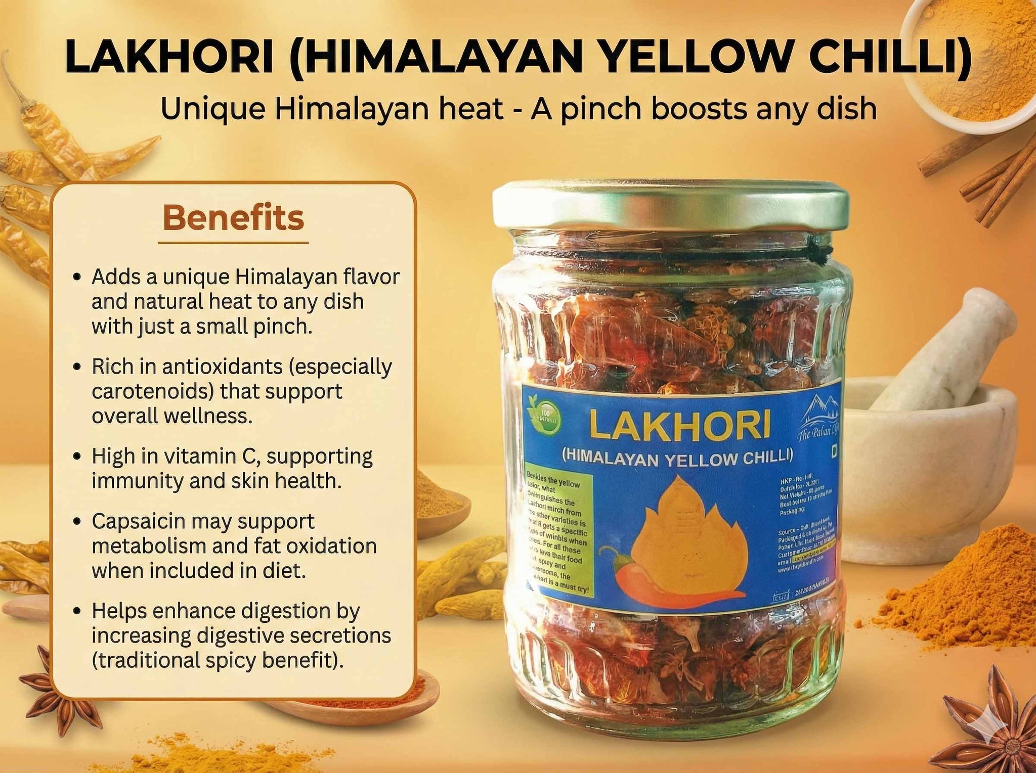 Sourced directly from certified organic farmers of Uttarakhand, Lakhori Mirch is a unique Himalayan yellow chilli that originated in the village of Lakhora, located on the Garhwal–Kumaon border. Easily recognised by its yellow colour and distinctive wrinkled skin after drying, this chilli is known for its intense heat and compact seed structure. It is found in two forms—small Lakhori Jamri used for flakes, and larger pods used whole or ground into powder.