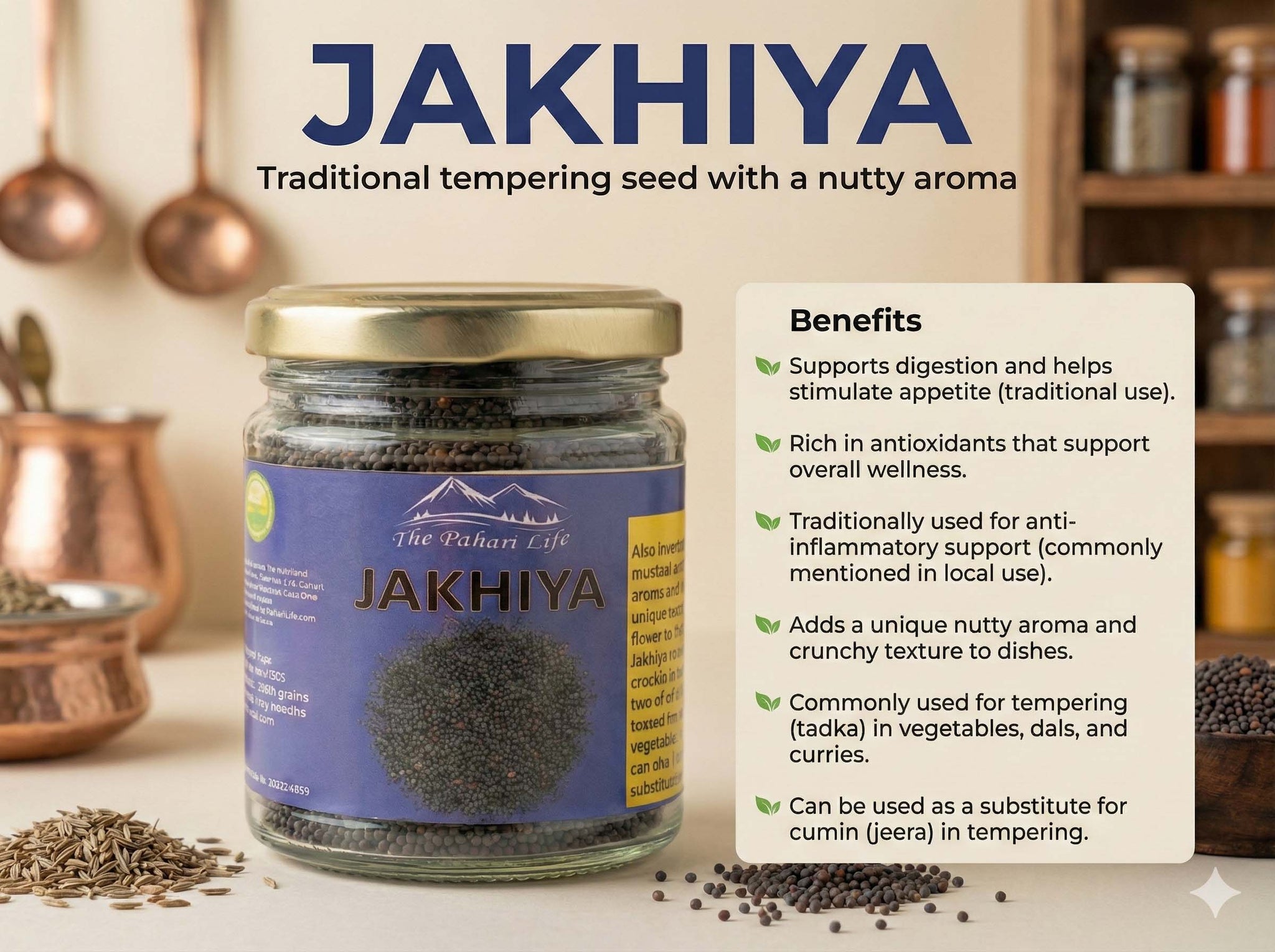 Pahari Jakhiya is sourced directly from certified organic farmers of Uttarakhand and carefully harvested from the high Himalayan forests of the Munsiyari region. Also known as Jakia, Jhakiya, or Jakhya, this tiny seed—often referred to as wild mustard or dog mustard—is small, dark brown to black, and even finer than mustard or sesame. Though technically a weed grown among crops in traditional multi-cropping systems, Jakhiya is prized for its powerful flavour, nutty aroma, and signature crunch.