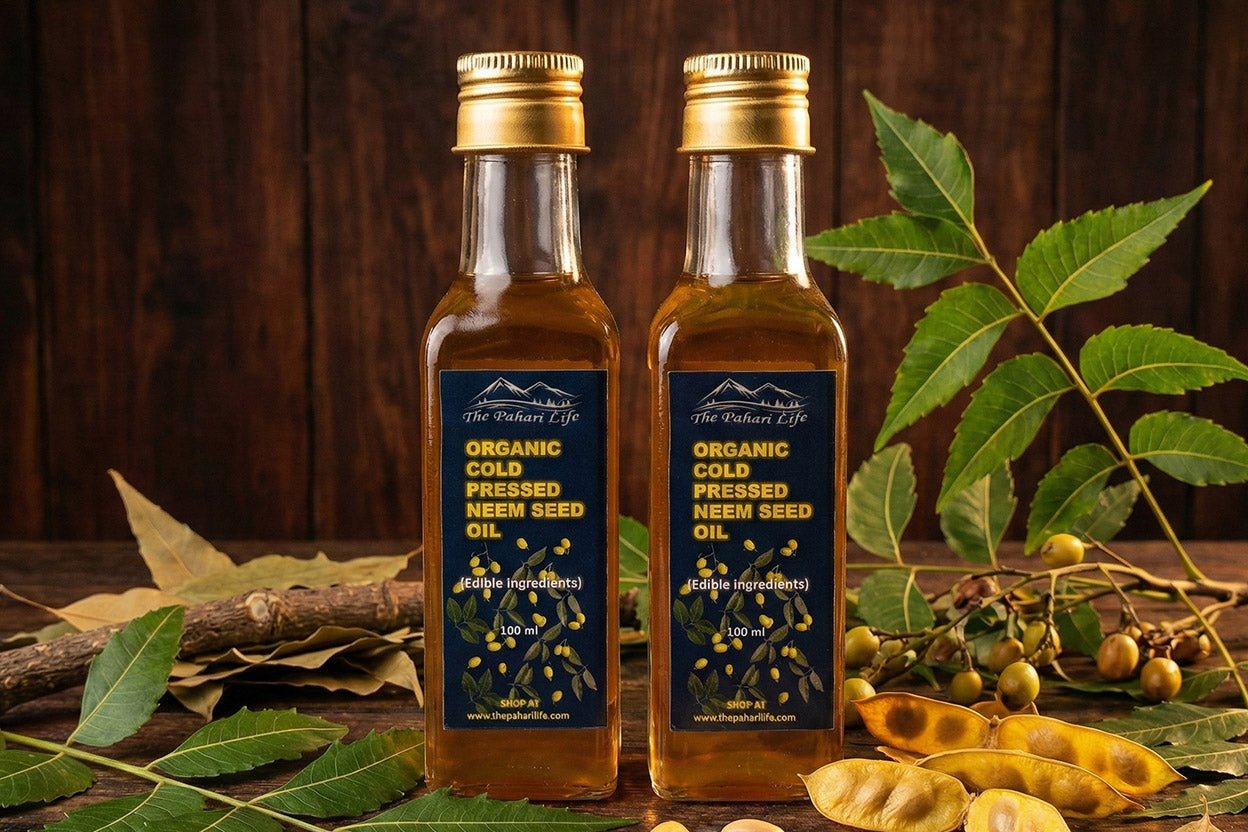 The Pahari Life's Neem Oil is extracted from the Neem seeds through a cold-pressed method and contains no additives. Rich in antioxidants, Neem Oil has been used for centuries for treating both skin and hair disorders. Its antibacterial action treats skin issues such as acne, rashes, hyper-pigmentation, burns, and abrasions while protecting and moisturizing with its high Essential Fatty Acid and Vitamin content. In addition, it clarifies the hair and scalp to relieve dandruff and environmental damage and stimulates hair follicles to improve hair volume and growth. Benefits also include its use in household items such as mosquito repellent, disinfectant, and personal hygiene. It’s also great for organic and non-toxic plant spray. The anti-bacterial, astringent and anti-fungal properties help in reducing the risk of infection. It helps to fight against free radical damage which slows down premature aging. It gets easily absorbed by the skin and helps remove dryness.