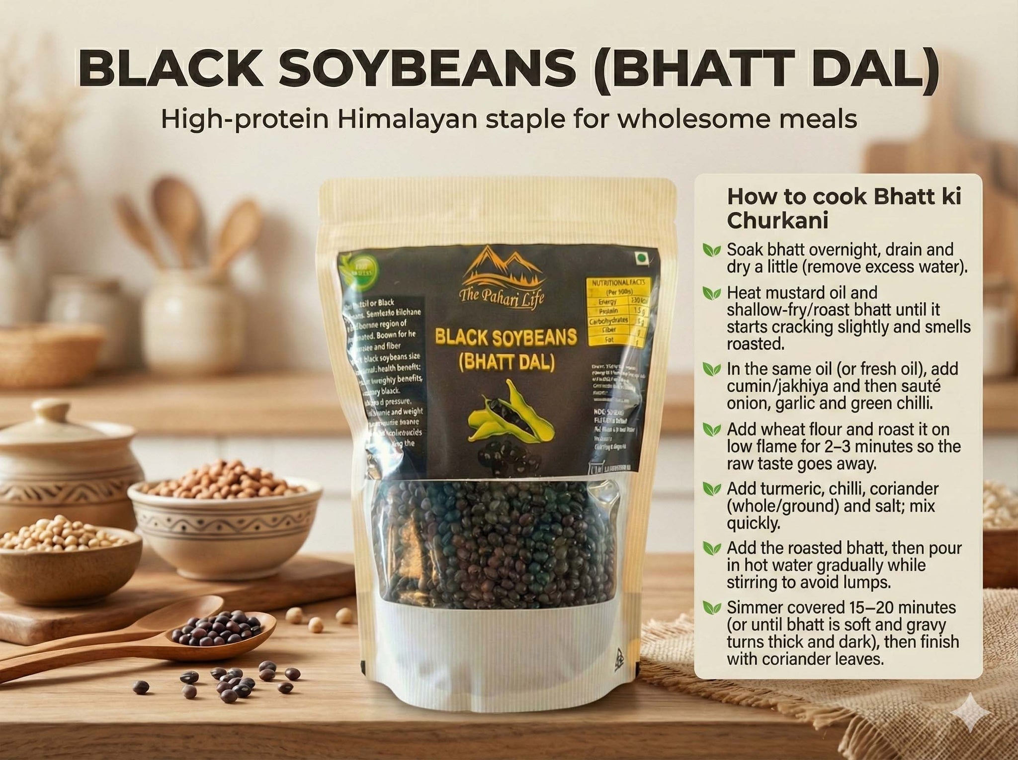 Pahari Bhatt ki Dal is sourced directly from certified organic farmers of Uttarakhand and is made from organically grown black soybeans cultivated in the high Himalayan regions. A staple in Garhwal and Kumaon kitchens, Bhatt belongs to the leguminosae family and is valued for its rich protein and iron content. This traditional lentil has been an integral part of hill cuisine for generations and is known for its robust taste and nourishing qualities.