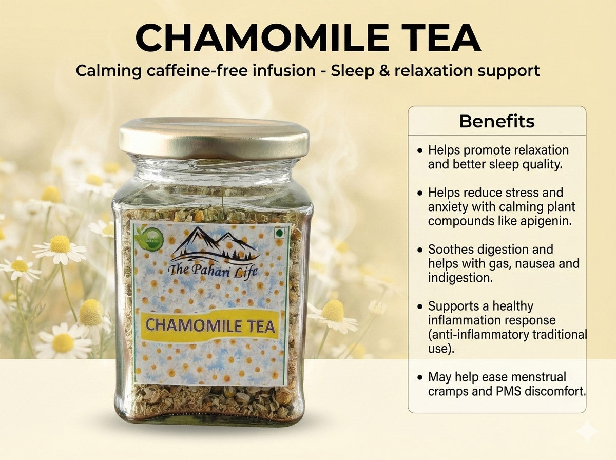 Pahari Chamomile Tea is prepared from dried chamomile flowers, a daisy-like plant belonging to the Asteraceae family, traditionally valued for its calming and healing properties. The flowers and buds are carefully harvested as they bloom and then gently dried to preserve their aroma, flavour, and therapeutic qualities. Known as Babune ka Phal in Hindi, chamomile has been consumed for centuries across cultures as a natural herbal infusion.