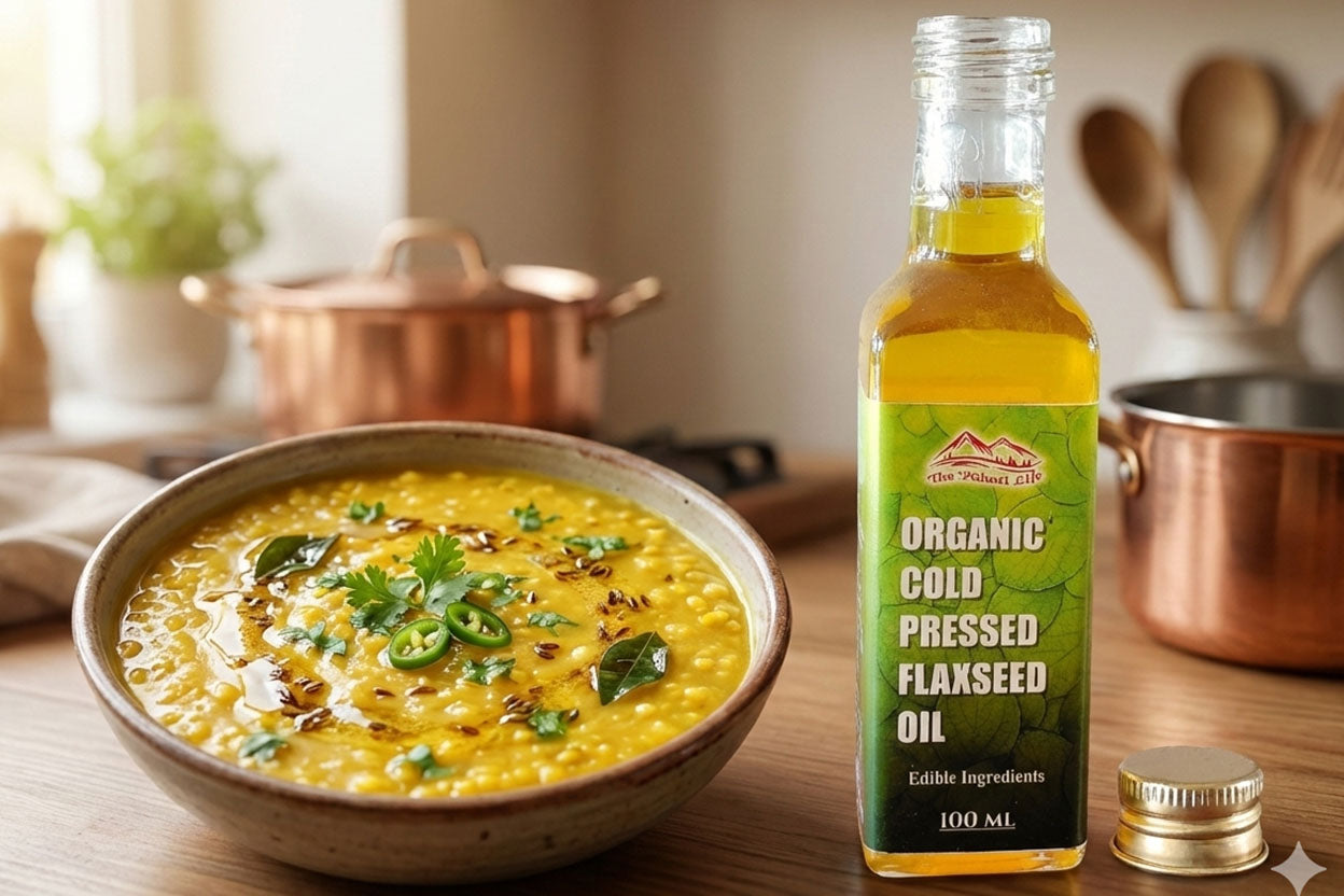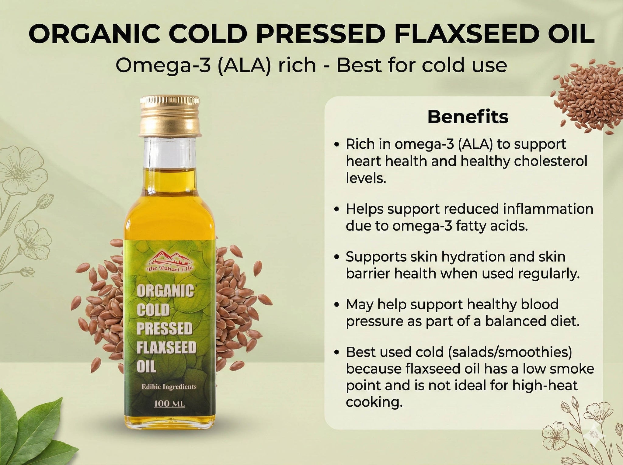 Discover The Pahari Life’s next-level organic wellness with this 100% pure, cold-pressed Flaxseed Oil made from ripened and dried flax seeds, with no chemicals or heat used in extraction. Cold pressing at room temperature helps retain the oil’s natural nutrients, flavour, antioxidants, and vitamin E, making it a healthier and more nutritious choice than refined, hot-pressed oils.