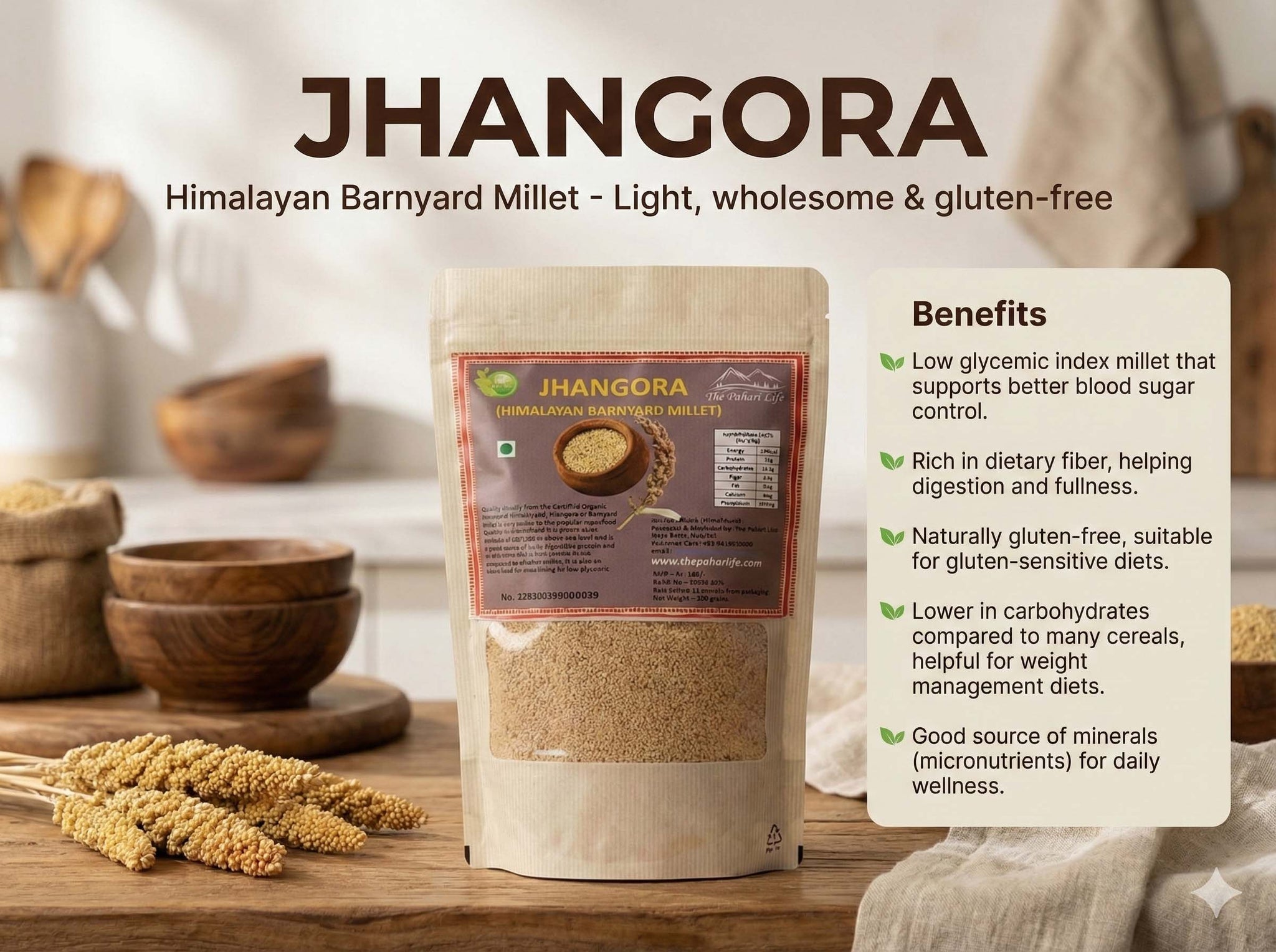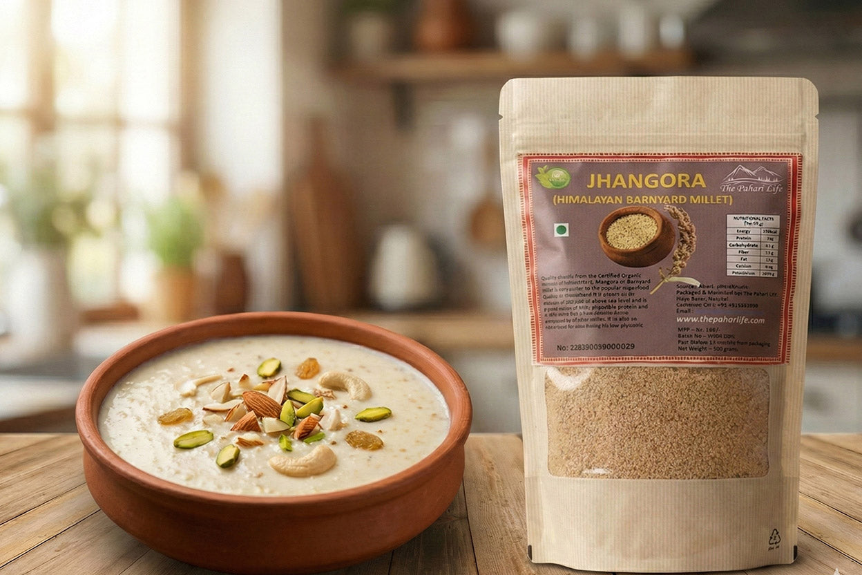 Pahari Jhangora, also known as Barnyard Millet, is sourced directly from certified organic farmers of Uttarakhand and grown naturally at altitudes ranging from 400 to 2,100 meters above sea level. One of the oldest grains known to mankind, Jhangora is often compared to quinoa due to its nutritional richness, yet it remains lighter, more digestible, and lower in calories than most cereals. It is considered one of the least allergenic grains and is especially suitable for people with sensitive digestion.