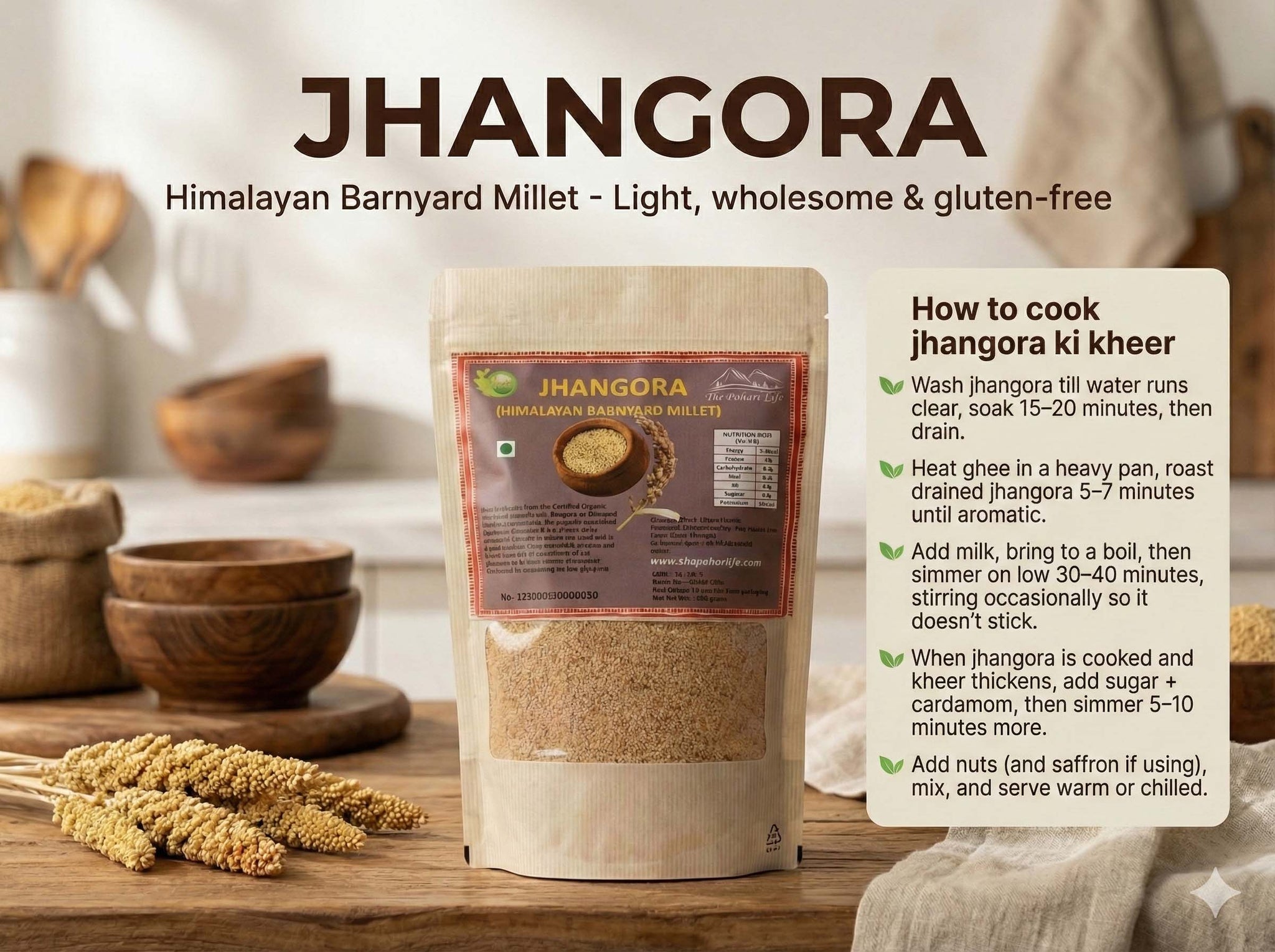 Jhangora is a rich source of highly digestible protein and dietary fibre and has a low glycemic index, making it an ideal food for diabetics. It is also abundant in essential minerals and phosphorus, which play a vital role in bone health, teeth strength, and cellular metabolism. De-husked Jhangora grains are light brown and oval-shaped, closely resembling quinoa in appearance. Traditionally used during Navratri fasting in Uttarakhand, it provides sustained energy while being light on the stomach. In the hills, it is used to prepare nourishing dishes such as festive kheer and Jhangora ka Chencheda. Extremely versatile, this millet can be cooked like rice or semolina and works beautifully in pilafs, savoury dishes, and desserts. Grown locally and sustainably, Jhangora represents a climate-resilient, eco-friendly food choice for the future.